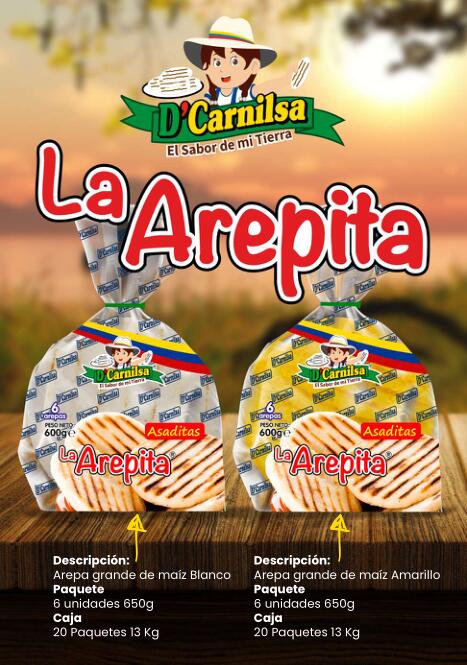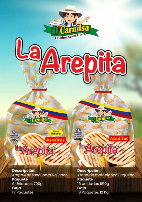 Existen infinidad de tipos de arepas, al igual que su forma de preparación, pero a continuación les describiremos las producidas como “Arepas colombianas”, y que pueden encontrar aquí, correspondiente a la firma “D´CARNILSA, empresa conocida en Europa por la fabricación de varios productos colombianos principalmente: